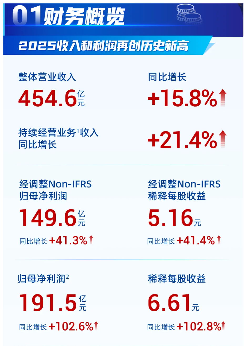 盈利能力飞跃:归属于上市公司股东的净利润(归母净利润)达192.0亿元,同比增长105.2%。更具参考价值的 “经调整Non-IFRS归母净利润”为149.6亿元,同比增长41.3%,远超收入增速,显示出强大的经营杠杆和盈利转化能力。