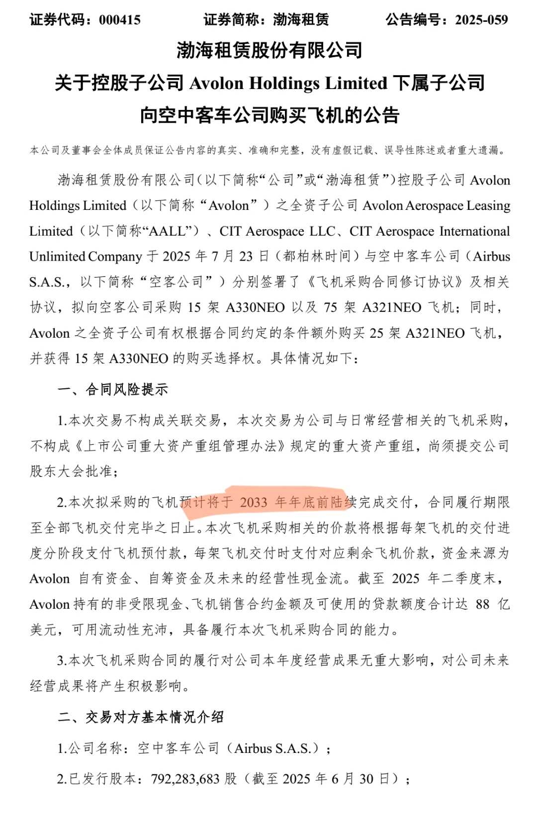 回复@青春的泥沼: 青春大,请教如何看待航空租赁行业上限太低的问题,航空租赁头部AerCap市净率也就1.2,其他都破净,市盈率连个15倍的都没有。那么即使明年反转,是否股价的涨幅也是有限的?//@青春的泥沼:回复@阳阳羊羊仔:第一,有需求,而且每年都得慢慢淘汰一些到龄的老久飞机,第二,现在下订单,也是几年以后才能拿到飞机,还得顺利不延期的情况之下了,渤海租赁的海外租赁公司在一个月之前的七月份向空客下的订单,最晚都得2033年底交付完毕了,这还是顺利的情况下,2033年可是8年以后 查看图片