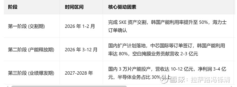 目前的进展:第一阶段 (交割期)2026 年 1-2 月完成 SKE 资产交割,韩国产能利用率提升至 50%,海力士订单确认。 第二阶段 (产能释放期)2026 年 3-12 月国内扩产计划落地,中芯国际等订单签订,韩国产能利用率达 80%,空白掩膜业务贡献营收 2-3 亿元。第三阶段 (业绩爆发期)2027-2028 年国内 3 万片产能投产,营收达 10-12 亿元,净利润 3-4 亿元,半导体业务占比 30% 以上。