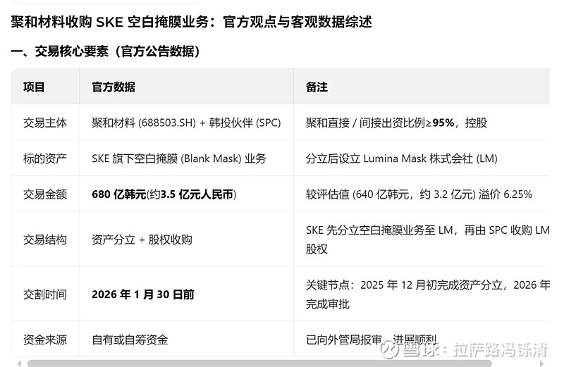 680 亿韩元 (约 3.5 亿元人民币)收购 SK Enpulse 株式会社 (SKE) 旗下空白掩膜 (Blank Mask) 业务全部资产,包括土地、厂房、设备、专利、技术及人员等。其中聚和材料直接或间接出资比例不低于95%,交易预计于 2026 年 1 月 30 日完成交割。可以明确地说,这个不是终点,而是一段周期的起点,参考易中天的2025.1月。交易采用资产分立模式:SKE 先将空白掩膜业务剥离至新设立的 Lumina Mask 株式会社 (LM),聚和材料通过 SPC 收购 LM 100% 股权。
