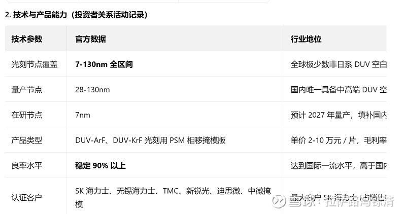 唯一标的稀缺性:国内唯一具备中高端 DUV 空白掩膜量产能力企业,A 股无直接对标,估值溢价空间大 (PS 30-50 倍) 。