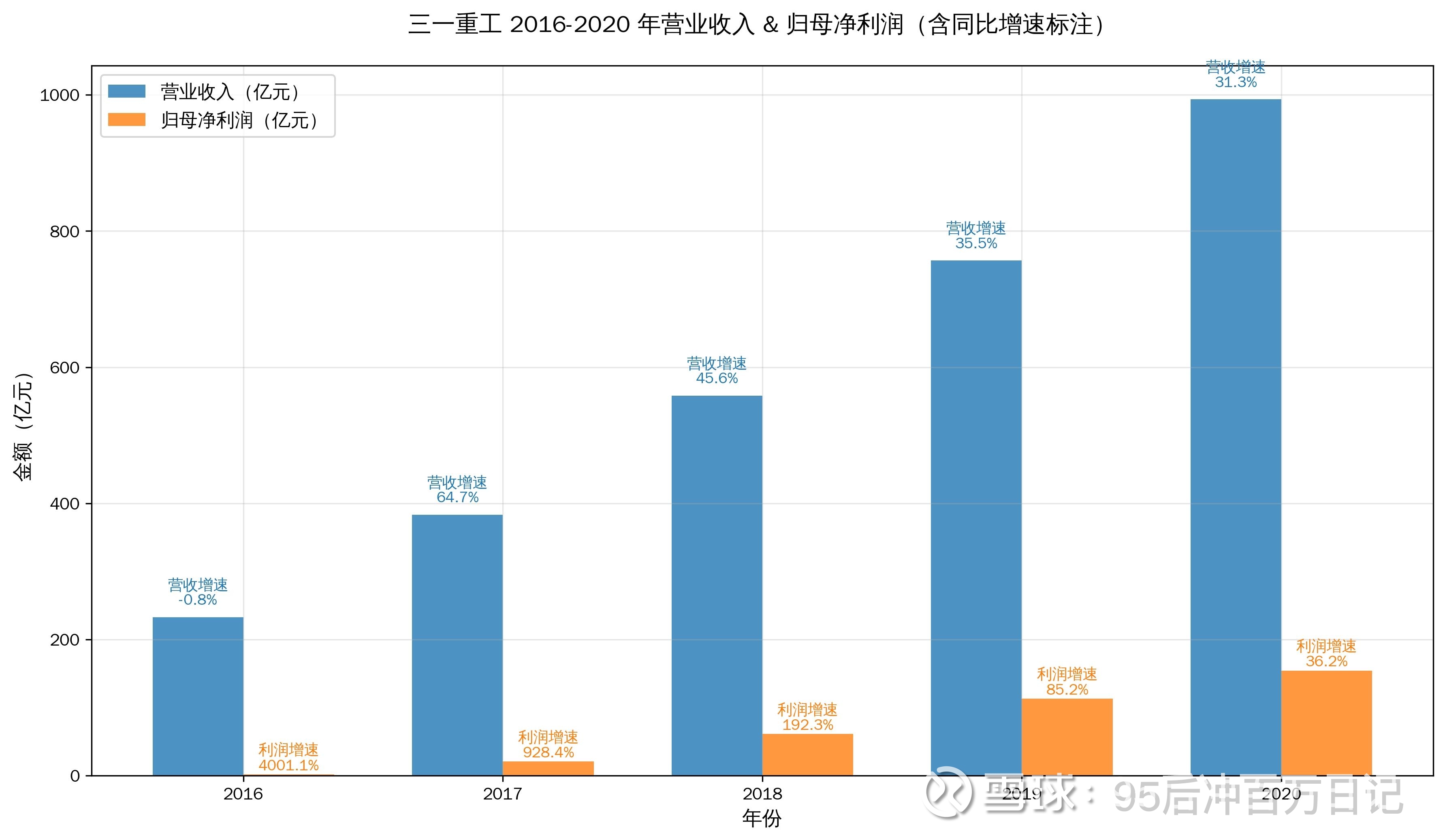 上一轮工程机械的上行周期,从2016年开始,一路涨到2020年,三一的业绩狂飙,营收从232亿飙到993亿,直接翻3倍,归母从2亿涨至154亿,暴增75倍。反应在股价上,从4块冲到45块,4年10倍的涨幅,十分惊人