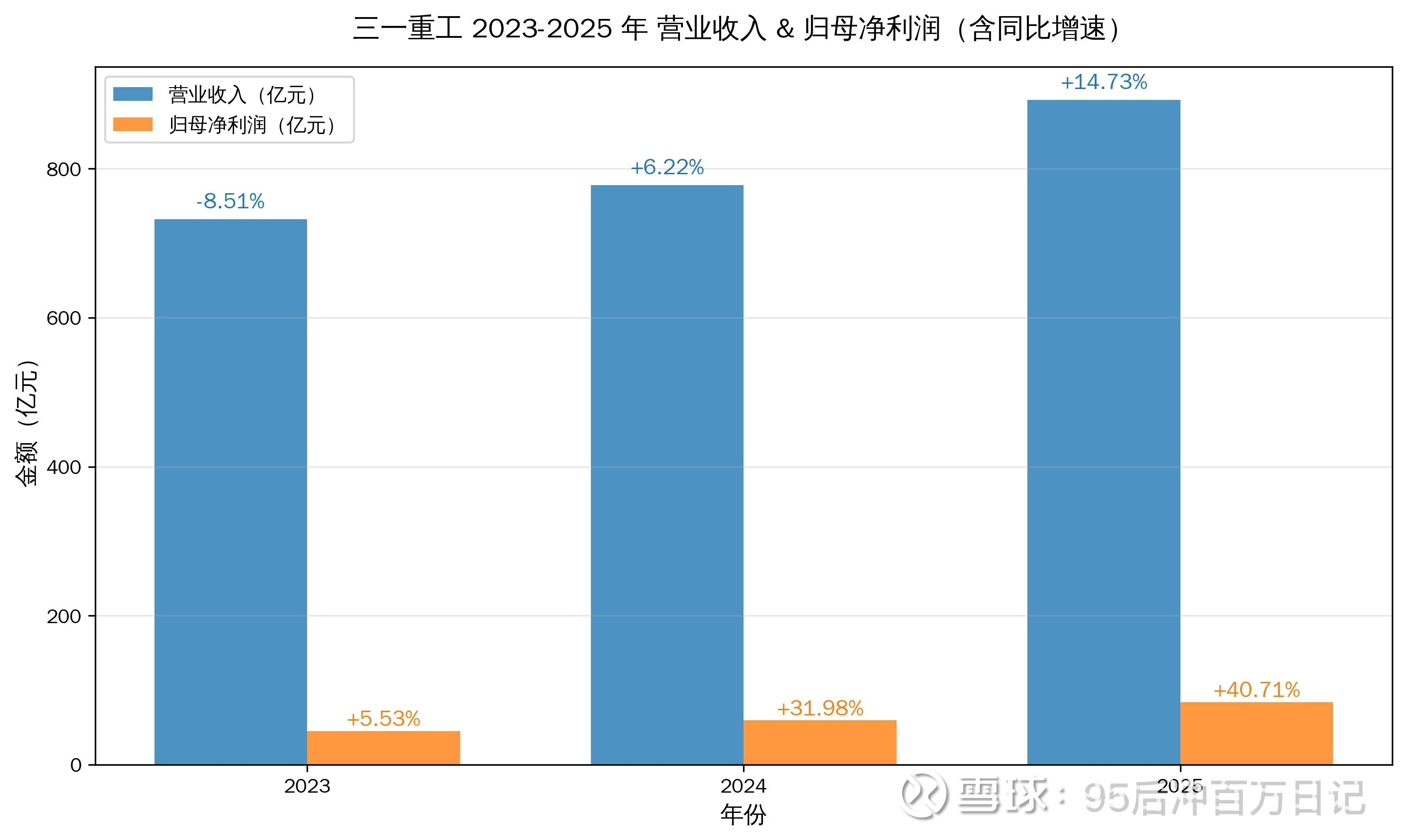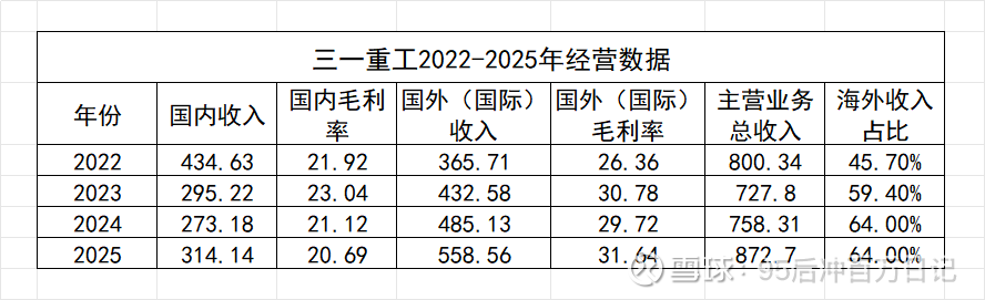 三一重工的年报出来,整体来说不错。业绩数据上,营收897亿,同比增长14%,归母净利84亿,同比增长41%。国际业务收入占比超60%,而且毛利率比国内业务高快10个点,贡献了主要利润来源。国内业务止跌,营收相较于2024年开始反弹。