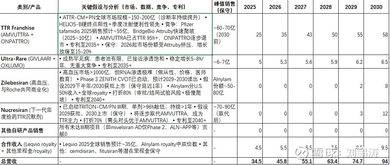 2025年产品销售严格遵循公司最新指引中值($30亿)。 未上市产品:仅已启动III期的项目考虑贡献(zilebesiran已启动ZENITH CVOT,nucresiran已启动TRITON-CM/TRITON-PN),其他(如mivelsiran仅Phase 2、cemdisiran等授权项目)贡献计为0或仅里程金/royalty。 未上市产品打折:审批风险、爬坡慢、竞争等因素打6-8折。 市场渗透率保守:TTR领域考虑BridgeBio Attruby(已于2024年底获批)和Pfizer tafamidis强势竞争;高血压市场巨大但渗透极慢。 专利:TTR franchise主要专利保护至2033-2037年(平台+制剂专利),无近期LOE风险。 其他收入:Leqvio royalty(Novartis)+其他合作里程金/royalty保守估算。