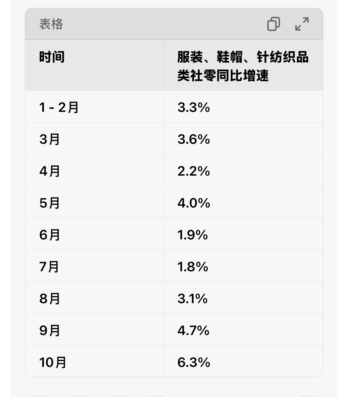 $江南布衣(03306)$ 其实跟大部分人直觉相反,近三个月服装消费是逐月走强的,从其他服装类上市公司业绩及唯品会三季报可以得到印证,也难怪股价比较坚挺。未来看点,主品牌保持中高个位数增长,onmygame过去一年零售总额同比增长70%,明年将开线下店,这块体量按照管理层预期未来可以到二十亿左右,未来几年将是增长引擎。买手店B1OCK也在加速拓展,目前已经进驻杭州上海北京深圳成都武汉南京等城市,口碑在业界也是有目共睹的,截止9月完整年度销售额大概一亿多,将国外小众设计师品牌引进国内也能增进管理层的行业洞察力,可能会对增长比较强的品牌展开并购或者合作。
