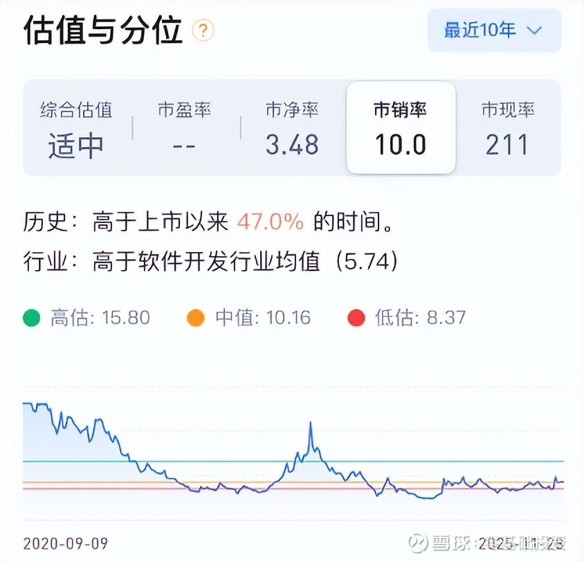 从估值上来看,由于净利润还是负数,看PE不太合适,这种SaaS企业很适合看市销率PS,即市值/营收。