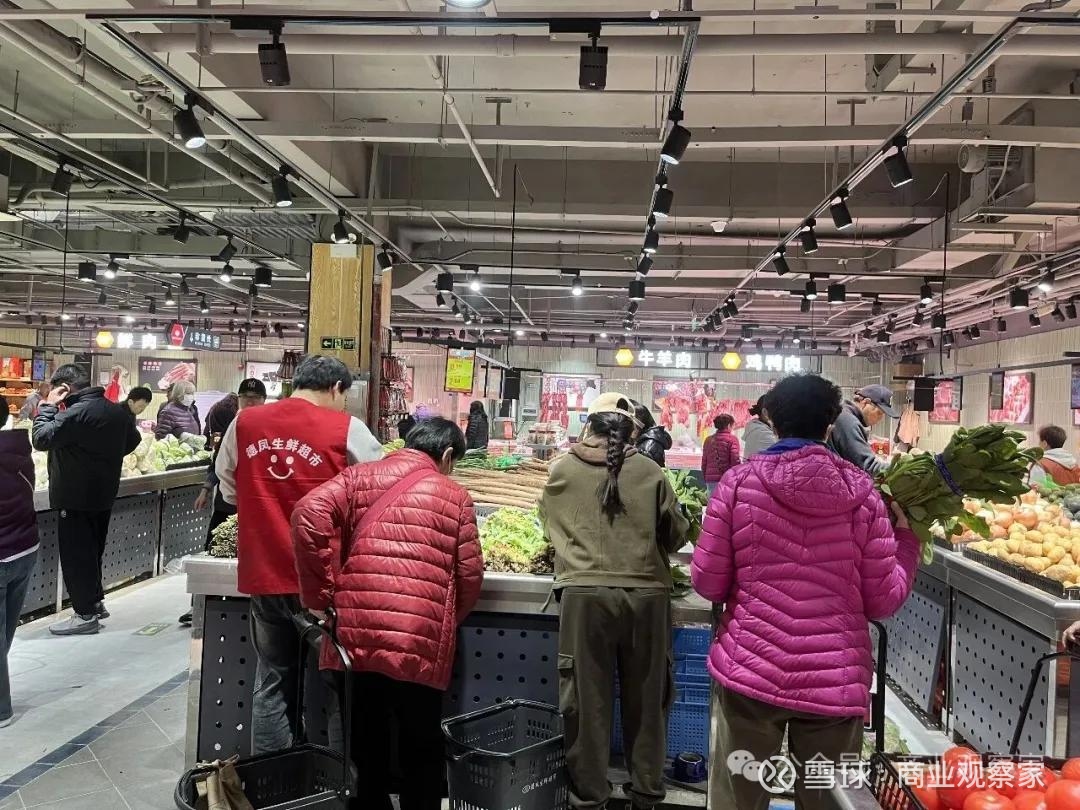 但德凤生鲜超市也保障了从果蔬到干货、主食的“卖相”都尚可,尤其是生鲜区,SKU非常丰富,生鲜区虽没有什么讲究的陈列和灯光辅助,但仅凭商品本身的丰富与饱满度,在客流氛围的加持下,就足以让人感受到浓厚的“烟火气”。它的人气让你无法联想“经济下行与消费寒冬”。
