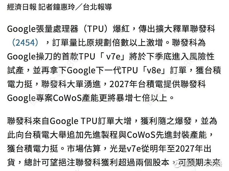 $长芯博创(SZ300548)$ 博通崩盘根本原因,今天台媒就来石锤了,其中一个重要原因,联发科才可以拿到产能,能够抢到台积电产能,谷歌必须通过联发科,才能让TPU产能猛烈扩张,2027年TPU产能直接比2026年暴增7倍!所以拥抱谷歌链光互联确定性最高的方向实锤进入谷歌光互联且占比最高的必须是我长芯大博创mpo增量超过预期,明年一季度硅光模块和aoc/aec也将取得谷歌订单,看好成为市场光龙头