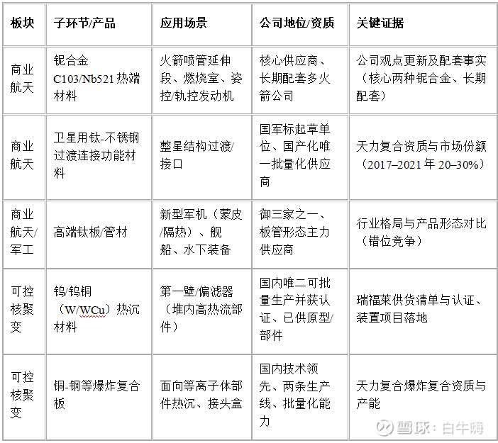 结论:西部材料在商业航天与可控核聚变两个板块,基于其在火箭发动机热端铌合金(C103/Nb521)、卫星过渡复合材料(钛-不锈钢,唯一批量化)、聚变堆第一壁/偏滤器用W/WCu热沉材料(国内唯二批量且获认证)与爆炸复合板工程化能力等子环节的资质与批量供货事实,构成“材料赛道的细分龙头”,是这两个主题炒作中绕不开的标的!