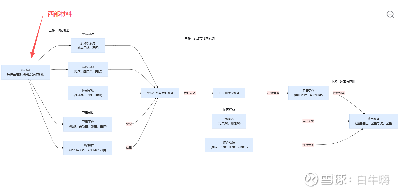 一图胜千言,先看看西部材料在商业航天产业链中的所处地位,可以粗暴的理解为整个产业的最上游: