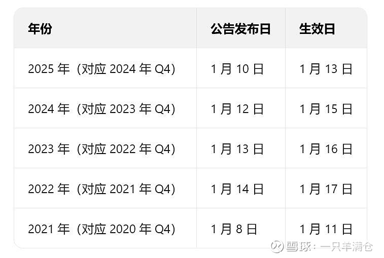 世纪华通满足所有条件,可参与本期季度调整。那么,来看看近五年的Q4调整公告发布时间与生效时间: