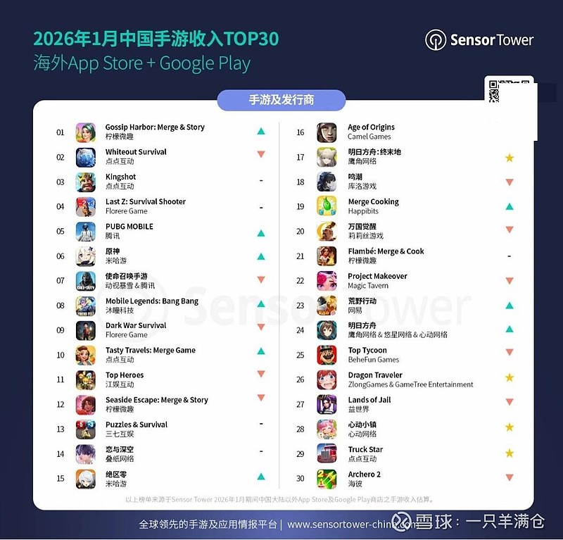 1月手游出海收入排行榜:wos、ks稳居前三,ttm进入前十,truck star新进前三十