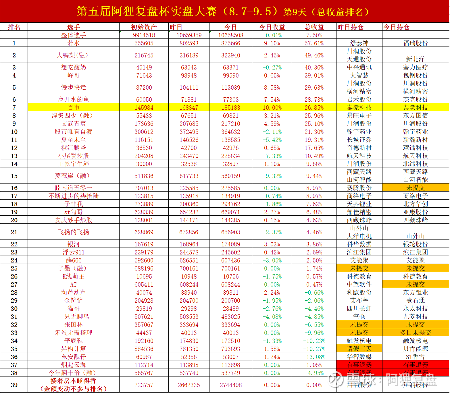 下面是第五届阿狸复盘杯今日赛况:(黄色为日收益率第一)
