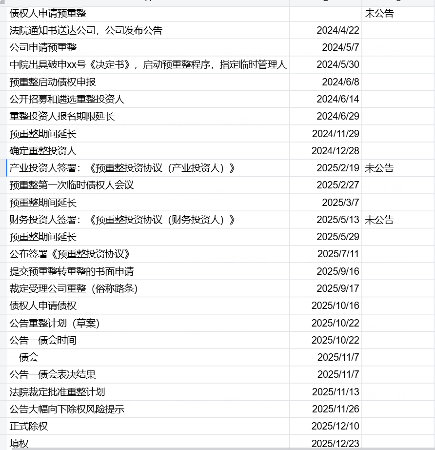 【这个公告简单复述了下进展,但无实质性进展,评论区网友认为未披露重整投资人的数量,不及预期,这里确实可以对比下去年的东园、今年的亚太我记得都公布了意向投资人】