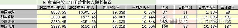 2025年新华保险营收增长19%领先,三年平均增长13.44%排第二,得9分。