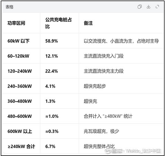 我国目前公共充电桩大概有480万个,私桩大概有1590万个左右,我国新能源汽车约4400万辆,其中纯电车约3100万辆,混动车约1300万辆。充电桩93%都是240KW以下的,其中60KW以下约为59%。一般来说60KW以下为慢充、60-240KW为快充,一般来说大部分城市里面运营车辆冲的都是120KW两枪的快充。360KW以上为超快充,1000KW以上为兆瓦闪充。因为国家电网资源有限,特别是老校区,第一没有那么多私人车位,第二安全问题,导致现在国家开始限制安装7KW的私桩,在叠加现在是大电池趋势100度以上,那么100度电池用7KW充电预计要冲14小时,而今年两会交通部长提出我国公桩加电桩已经覆盖98.8%的高速公路、服务器、和城市,但是大功率充电桩占比极低,今年的目标是加大大功率充电桩的的建设。可以预见未来,拥有私桩的私家车占比仅为30%左右,而公共快速加电成为主流。