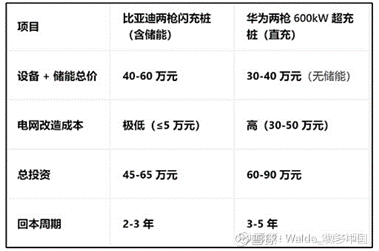 看看现在拥有超充装的企业分别为H(600KW)、L(480KW)、X(480KW)等超充桩与比亚迪闪充桩成本比较(友商W换电站成本太高不在讨论范围)。