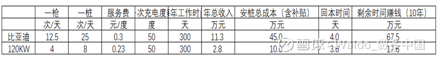 算一下比亚迪充电桩定价0.3元/度的收益,因为比亚迪目前充电桩有四种模式(1)自己找地,自己拉线、自己租地、自己购买设备;(2)找那种资产利用率较低的120KW桩或者60KW桩,然后租这个地直接在基础上建设闪充站,不需要拉线大规模土建,自营;(3)比亚迪出设备,充电桩的拥有者出地,按比例分层;(4)比亚迪卖设备。因为第一种成本太高,比亚迪不会走第一种路线自营,大概率走第二种路线自营。我们开始计算,一般来说120KW城市里面两枪,大概一天能用4.5次,每次50度,服务费在0.22元/度,一个桩加改变电网大概是10万元左右,约100元左右,一年工作300天月30000元,差不多3.33年回本,然后剩下7年大概赚21万元左右。比亚迪闪充桩量抢开放给所有车型,服务费0.3元,一天平均使用12.5次,设备成本加补贴一共45万元,一年工作300元,一次充电50度,一年11.25万元,4年回本,而后6年一共挣67.5万元,兆瓦闪充一定会带来更多流量从而影响减少其他低功率充电桩的充电次数,每天多出来的50-60分钟对于滴滴司机来说价值远大于5-10元甚至15元。