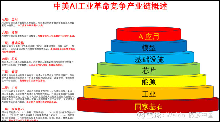 要想知道比亚迪是一家怎样的公司,我们再次来看一下AI产业链1+6层图,1代表国家基石,6层从底层到最高层分别为工业、能源、芯片、基础设施、模型、应用。
