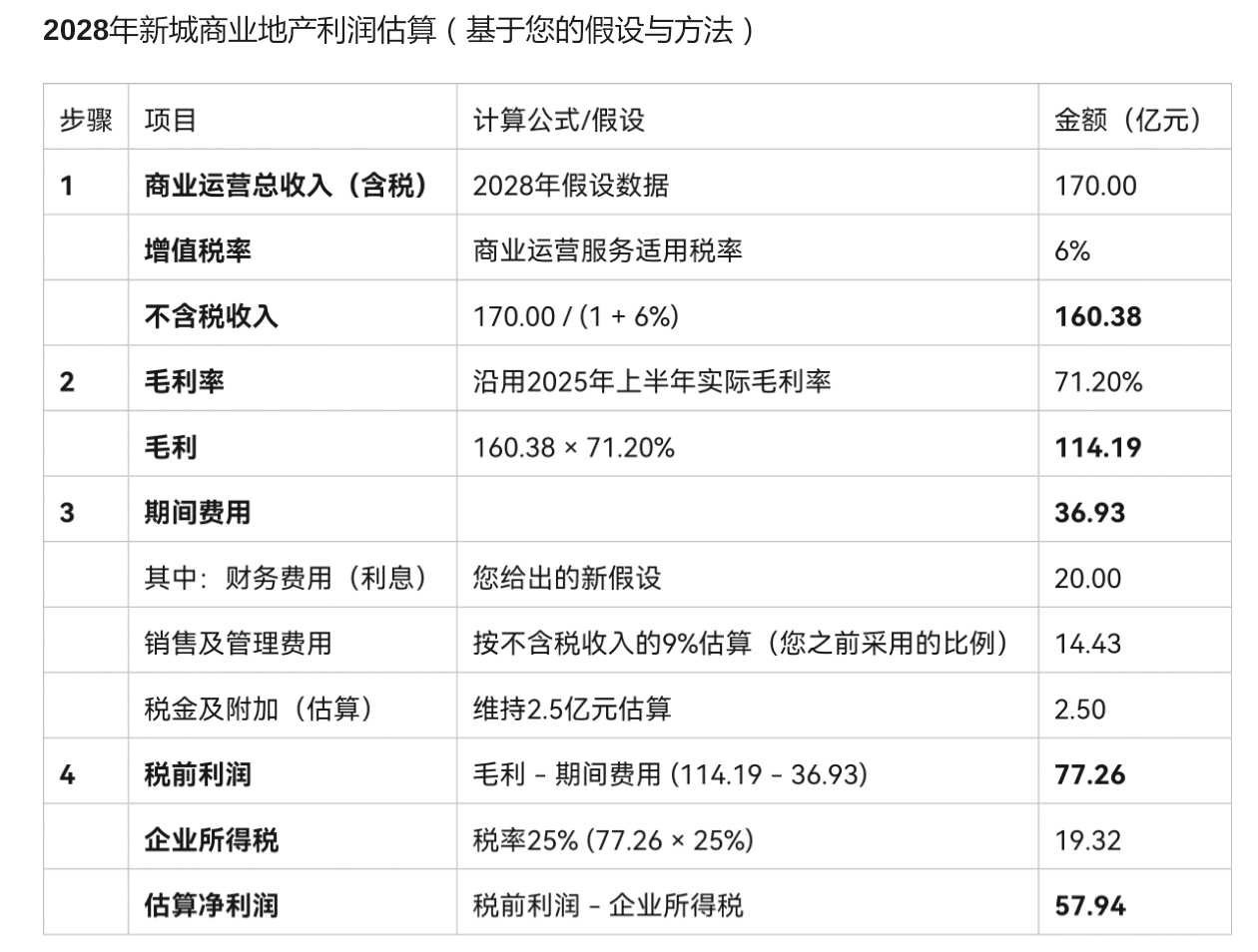 新城2028年利润=商业地产利润58亿+住开利润加计提-20亿+商业地产公允值不调整=38亿