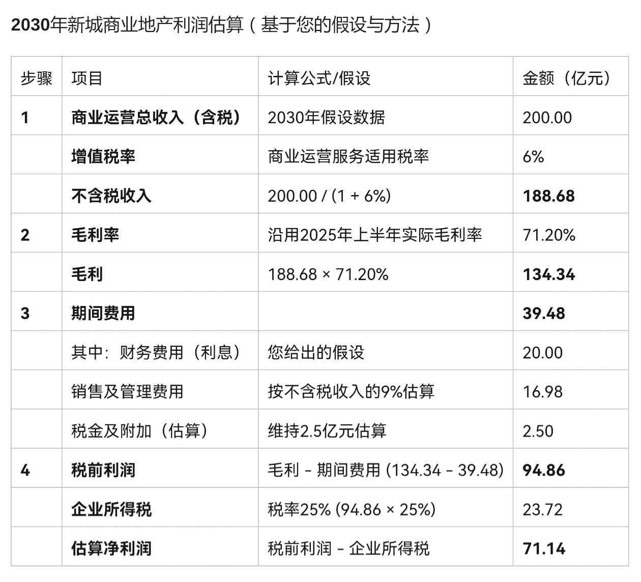 新城2030年利润=商业地产利润71亿+住开利润加计提0亿+商业地产公允值不调整=71亿