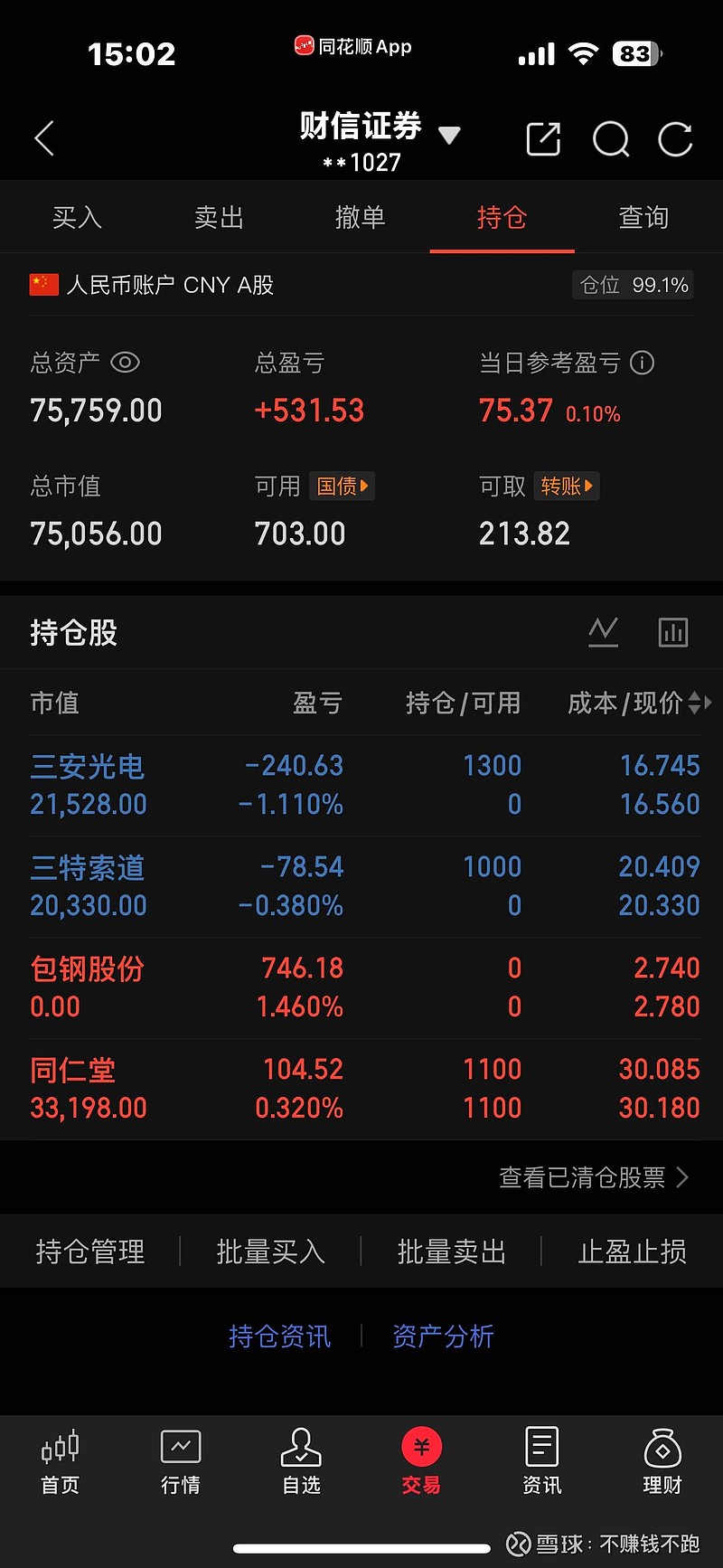 记录美好生活,今天早盘卖出了三特$三特索道(SZ002159)$ ,下午接回来,这都没赚到钱我也是无语了,$三安光电(SH600703)$ 三安下午接的都能让我跌一个多点,明天可能还有一跌,抄底抄的心情都不好了,同仁堂给你一个赞,这太稳了吧,今天虽然赚钱了,但是我的操作就是一坨,明天加油吧,明天大盘给点力吧,兄弟们喜欢的点点关注,每天实盘更新$上证指数(SH000001)$