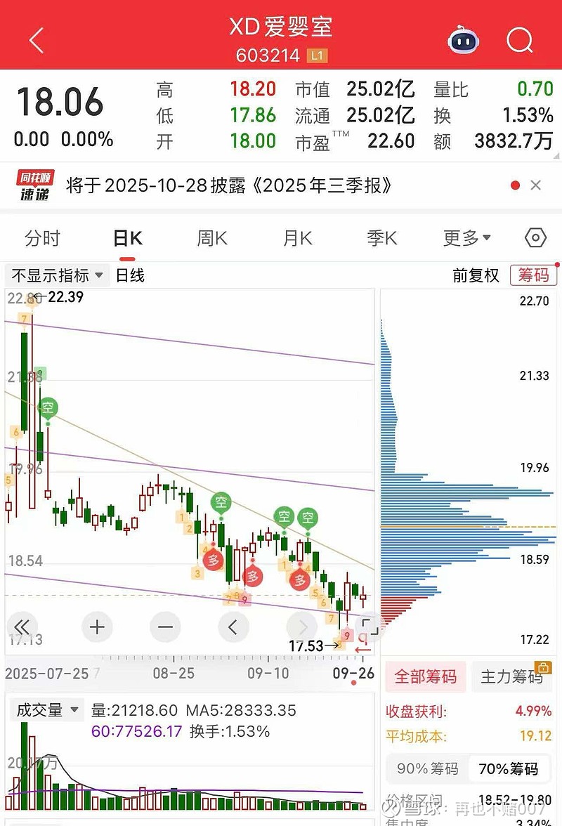 $XD爱婴室(SH603214)$爱婴室迟迟不上攻站稳19.22位置去消化下砸阴线的黄金坑,证明主力想下杀到17元位置,这股短期就废了,当前空方力量大于多方,空头趋势有延续苗头,老庄反复低吸拉高下砸,周五收盘主力持仓60%,90%筹码集中度7.28%,30%筹码集中度3.34%,在不拉升站上关键位置就像孩子王一样筹码峰三峰形态,上涨动能更加不足,阻力更大