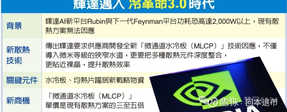 导火索,技术一直在迭代。英伟达AI新平台Rubin与下一代Feynman平台因电晶体再次翻倍成长,算力持续大幅升级,功耗同步剧增,甚至可能达到2000W至3000W,届时传统水冷板也将无法满足散热需求,必须采取新技术应对。供应链传出,英伟达要求供应商开发全新"微通道水冷板(MLCP)"技术,要把多种散热元件深度整合,这或将成为英伟达"冷革命3.0"技术主流。