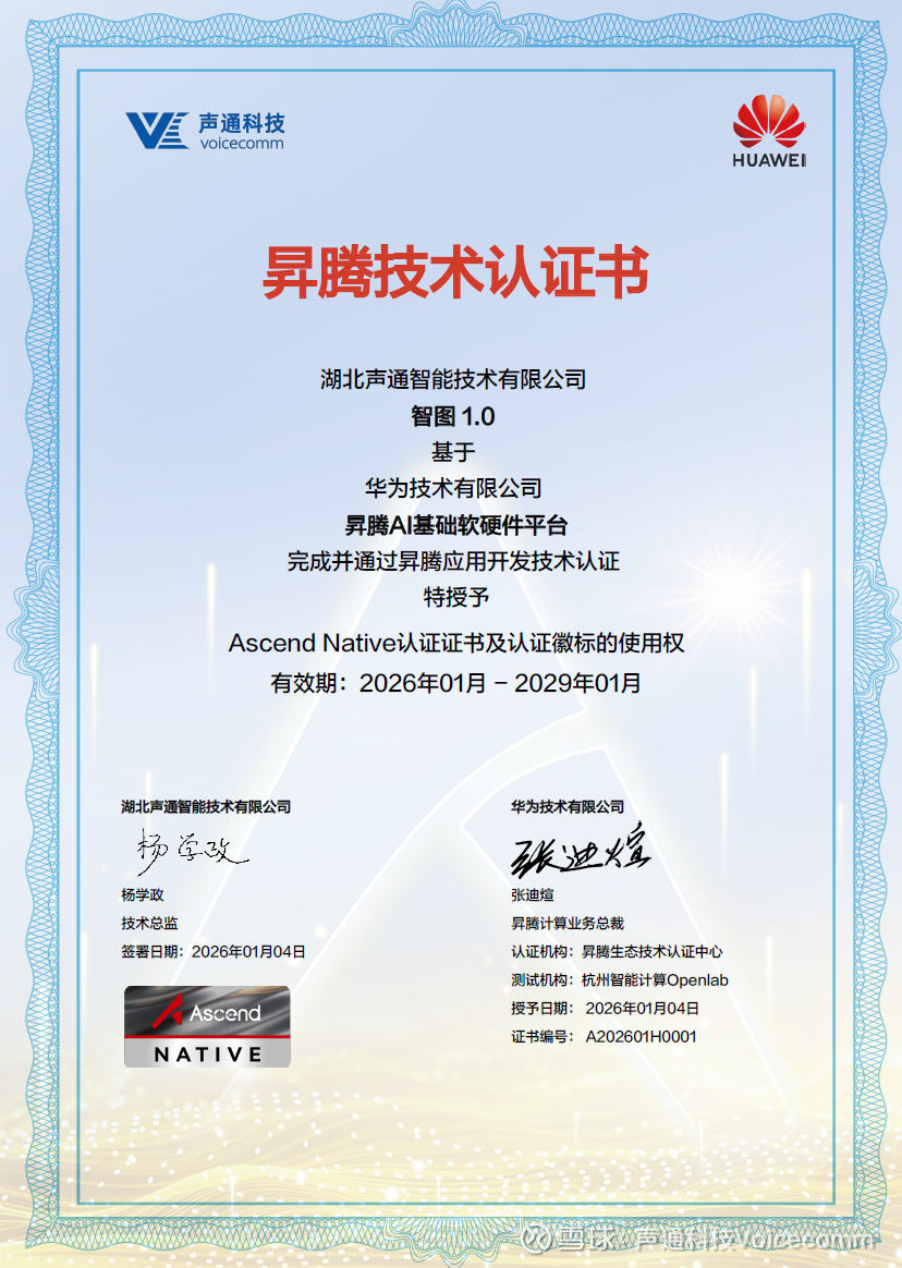 2026年1月,湖北声通智能技术有限公司自主研发的“智图”系统,已正式通过华为昇腾AI基础软硬件平台的技术认证,获得“Ascend Native认证证书”及官方认证徽标使用权。认证由华为昇腾生态技术认证中心与杭州智能计算OpenLab联合测试,并基于昇腾Atlas训练服务器完成验证——意味着声通“智图”在平台兼容、核心能力与工程化落地等维度,拿到了一张含金量很高的“硬核通行证”。