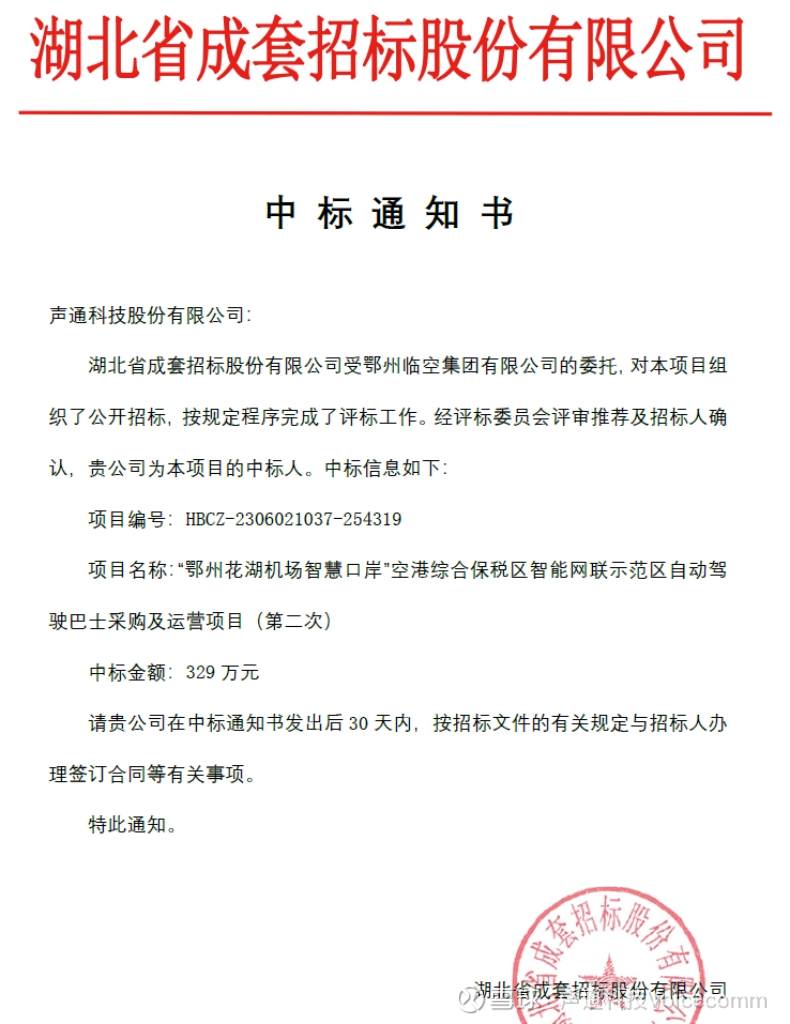 $声通科技(02495)$ 成功中标“鄂州花湖机场智慧口岸”空港综合保税区智能网联示范区自动驾驶巴士采购及运营项目。