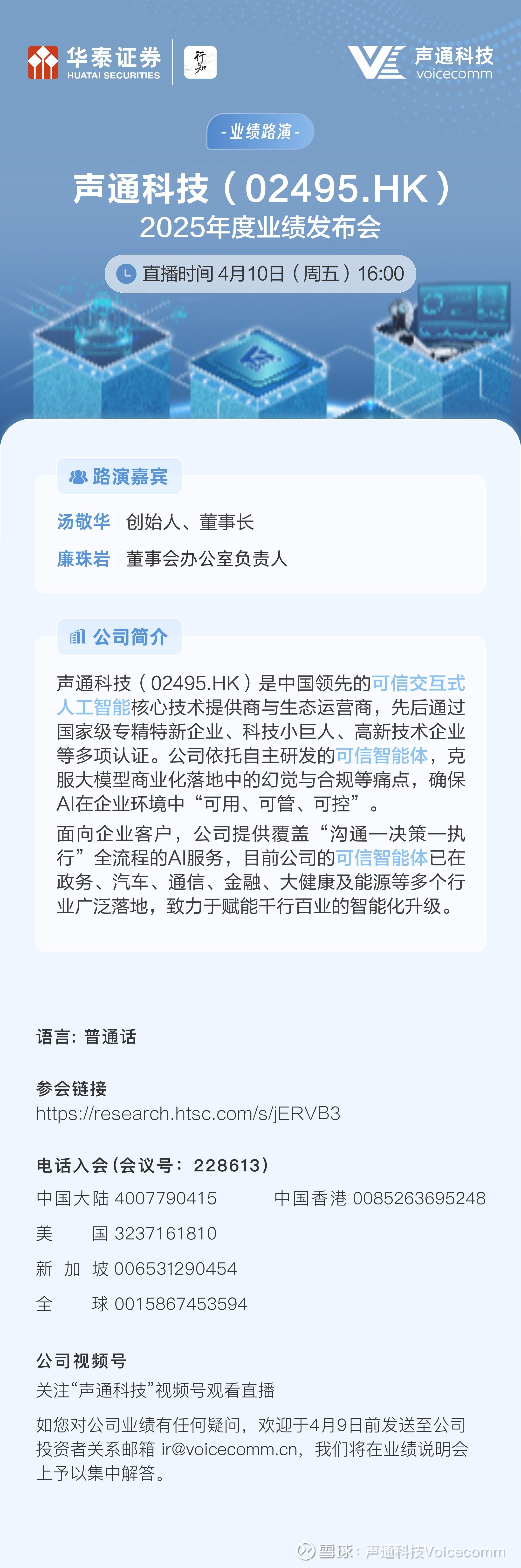 $声通科技(02495)$ 将于 2026年4月10日(星期五)下午16:00 举行 线上业绩发布会,欢迎各位关注并参与。