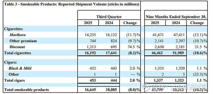 四大烟草公司的卷烟业务,除日烟增长1.7%以外,卷烟烟支的销售数量都出现了不同程度的下滑,业务主要在美国的奥驰亚,也就是大家熟知的万宝路品牌持有者,前三个季度按年下滑10.3%,不在美国经营的菲莫国际,也有
