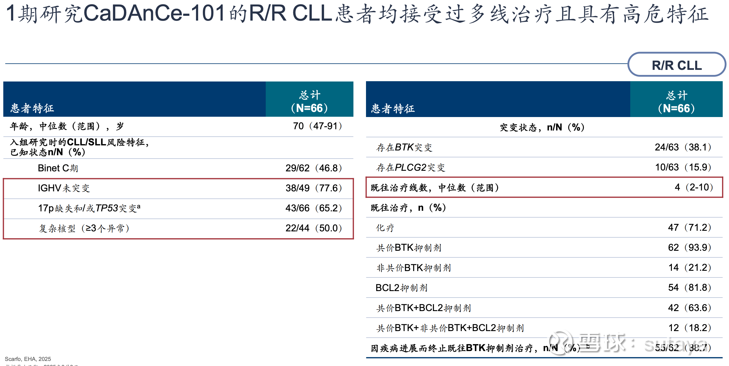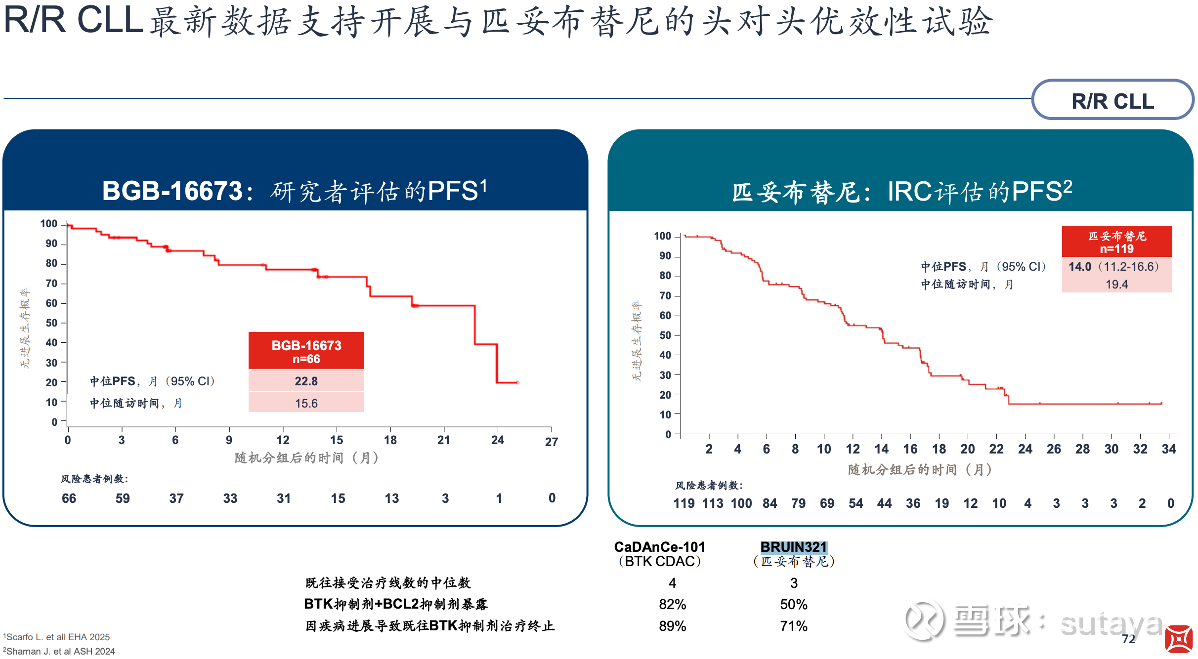 可以看到BTK CDAC比礼来共价BTK在BTK+BCL2治疗过的比例更大、疾病进展率更高,中位数治疗线数更高的情况下一下远远好于礼来共价BTK。