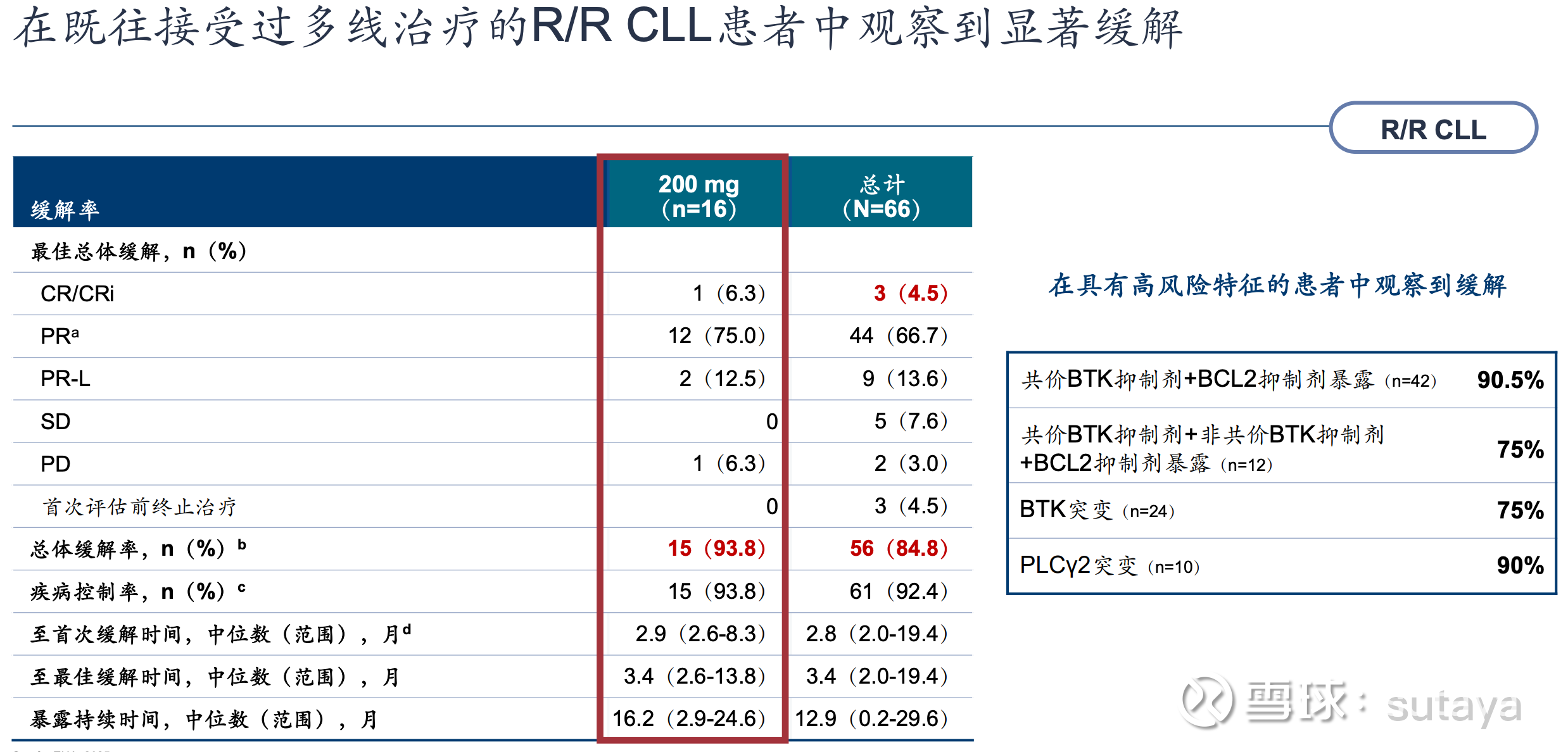 泽布替尼在RR CLL与伊布替尼的头对头实验中,2线病人ORR大概80+%,这里4线病人达到93.8%。。。这足以说明纬度上的打击。要是后面更大规模的临床实验保持住了数据,很有可能BTK CDAC将统治整个RR CLL了。