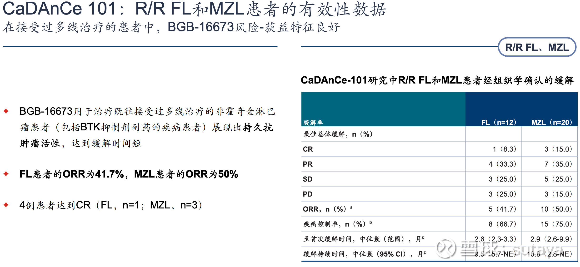 RR FL BTK CDAC与CD20单抗数据类似,泽布替尼没有看到单药数据,BTK CDAC + CD20 后续可以探索。泽布替尼RR MZL ORR 68%,BTK CDAC 50%,4线之后的数据还是厉害。