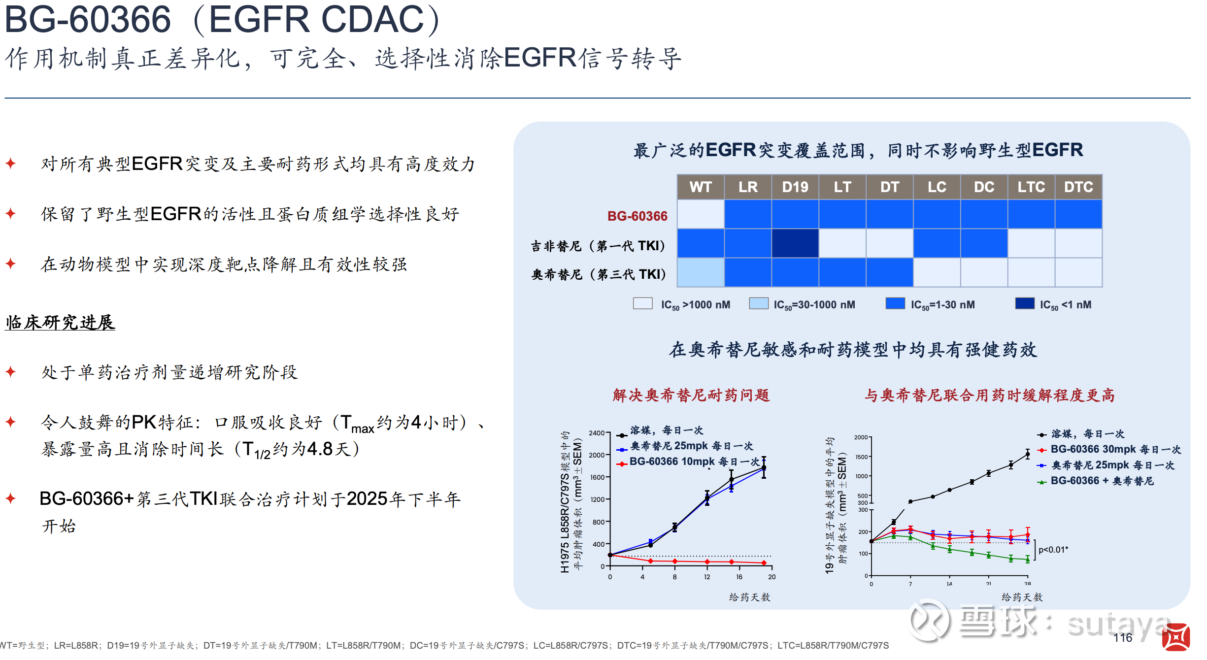 BG-60366是一款新型EGFR嵌合式降解激活化合物(CDAC),该产品可广泛覆盖多种EGFR突变,破坏EGFR支架功能,产生持久的信号抑制作用。当用于前期治疗线时,非冗余机制有望防止发生耐药。临床前研究显示,该产品对奥希替尼敏感和耐药的EGFR突变有效性较高,不影响野生型EGFR,蛋白质组选择性良好,每日口服给药表现出较强的有效性。