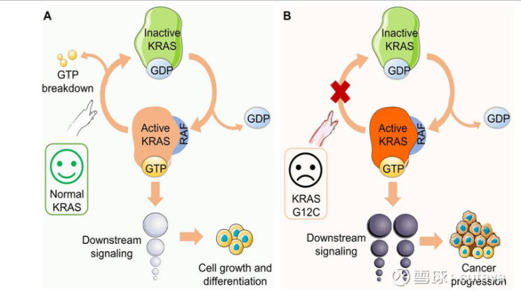 正常情况下,KRAS蛋白通过结合GTP(激活态)和GDP(失活态)的循环切换传递信号;然而,当KRAS发生致癌突变时,其GTP酶活性丧失,导致蛋白持续处于激活状态,驱动细胞不受控生长和肿瘤发生。