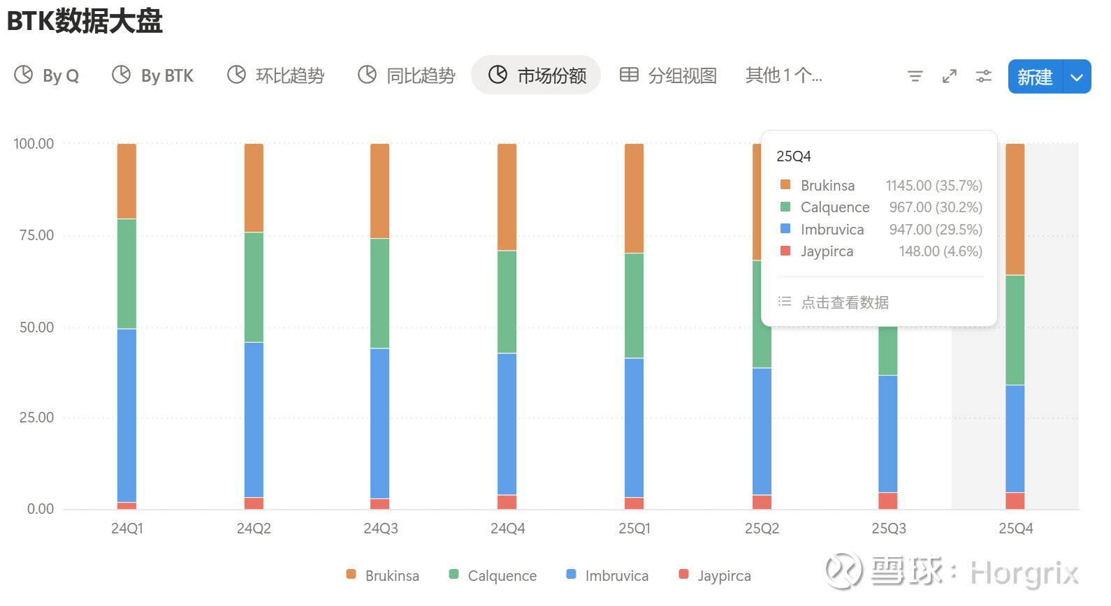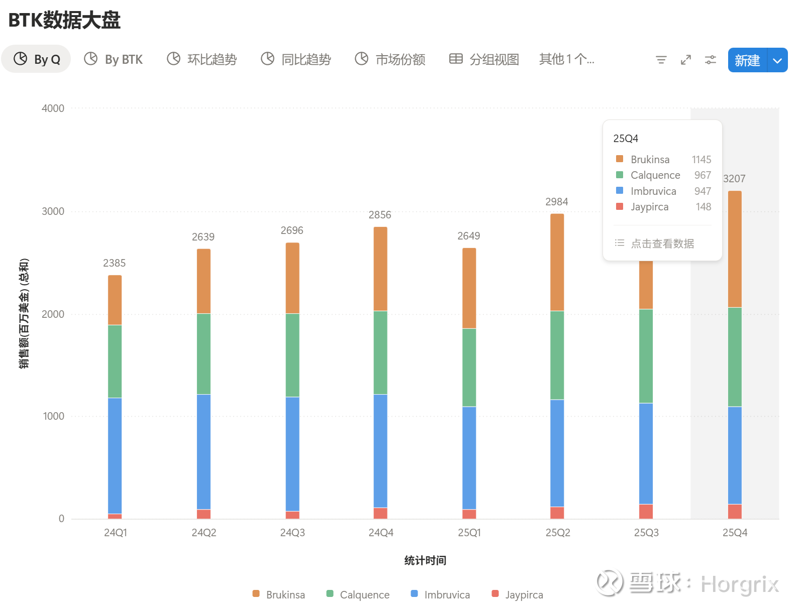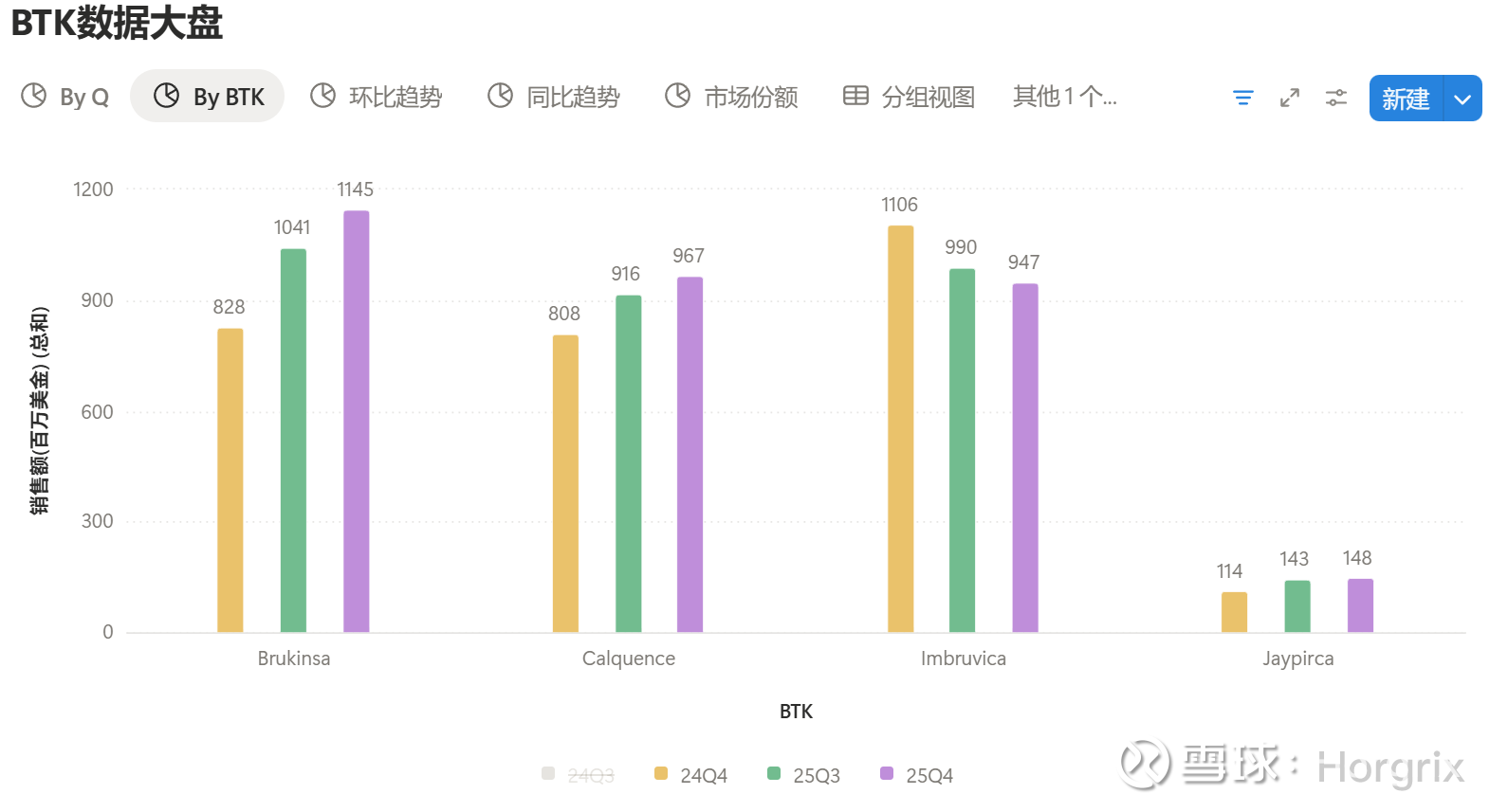 伊布替尼US市场开始出现加速丢失份额的趋势(已经连续2个Q同比下滑超过18%+, Q4更是同比-25%),伊布替尼按这个趋势26Q4可能会跌到单季度8亿左右销售额。