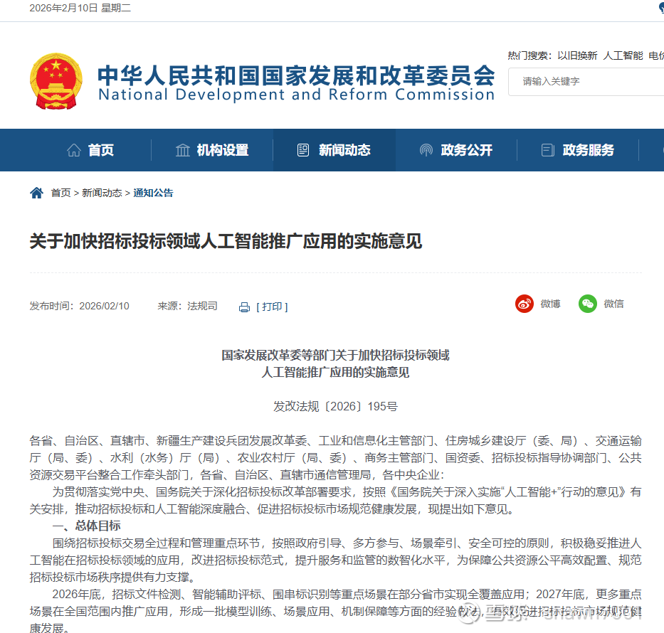 《国家发展改革委等部门关于加快招标投标领域人工智能推广应用的实施意见》发布