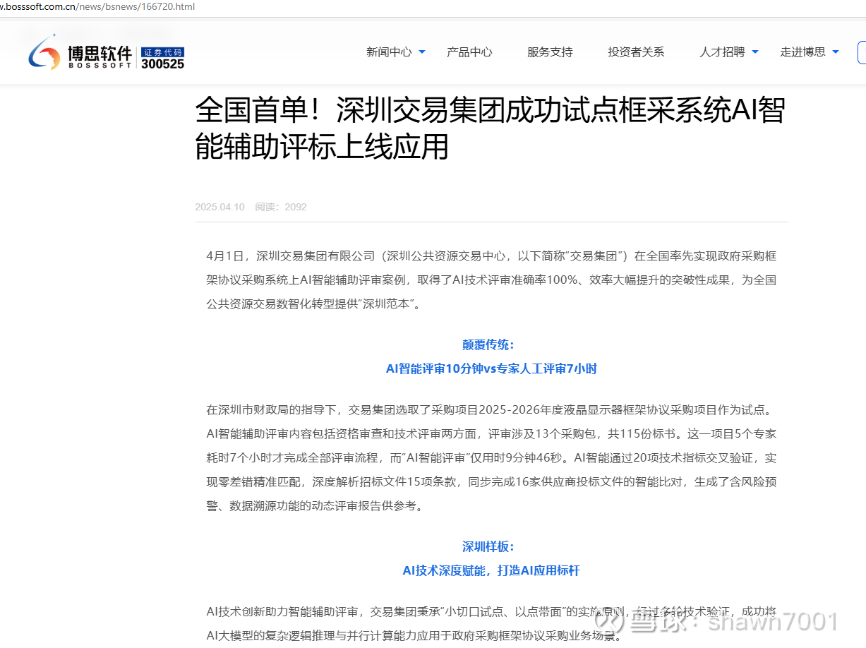 4月1日,深圳交易集团有限公司(深圳公共资源交易中心,以下简称“交易集团”)在全国率先实现政府采购框架协议采购系统上AI智能辅助评审案例,取得了AI技术评审准确率100%、效率大幅提升的突破性成果,为全国公共资源交易数智化转型提供“深圳范本”。在深圳市财政局的指导下,交易集团选取了采购项目2025-2026年度液晶显示器框架协议采购项目作为试点。AI智能辅助评审内容包括资格审查和技术评审两方面,评审涉及13个采购包,共115份标书。这一项目5个专家耗时7个小时才完成全部评审流程,而“AI智能评审”仅用时9分钟46秒。AI智能通过20项技术指标交叉验证,实现零差错精准匹配,深度解析招标文件15项条款,同步完成16家供应商投标文件的智能比对,生成了含风险预警、数据溯源功能的动态评审报告供参考。