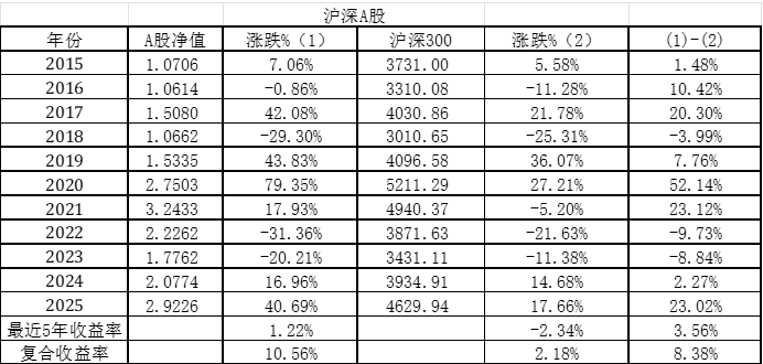 从2015年至2025年,最近10年国内A股的年复合收益率为10.56%,这个成绩只能说是很普通,主要原因就是2018/2022/2023年出现了3次超过20%的回撤。从2024年开始,我对投资策略做了比较大的调整,从注重成长股投资转变为注重股息率、讲究股债平衡的稳健投资,希望牛市时能跟上指数,熊市时能超越指数,不求大赚,只求不亏或少亏,避免大的回撤。从表1可以看出,2021年A股净值的最高点是3.2433,紧接着出现了连续2年大的回撤,后面经过2024年和2025年的努力,目前的净值仍然没有回到最高点,可见大的回撤对净值的影响是非常大的。