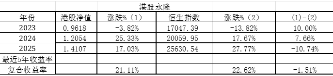 2025年港股市场的投资收益率为17.03%,同期恒生指数的表现为27.77%,跑输指数10.74%,如表2所示。港股账户的中国海洋石油和兖矿能源全年没有大的操作,新建仓了泡泡玛特。2025年,中国海洋石油不考虑分红的收益率为11.4%,考虑分红的全收益率为20.14%。兖矿能源不考虑分红的收益率为7.49%,考虑分红的全收益率为17.83%。泡泡玛特全年收益率翻倍,但是我是12月才开始建仓的,没有吃到这波红利,目前泡泡玛特还处于浅套中。