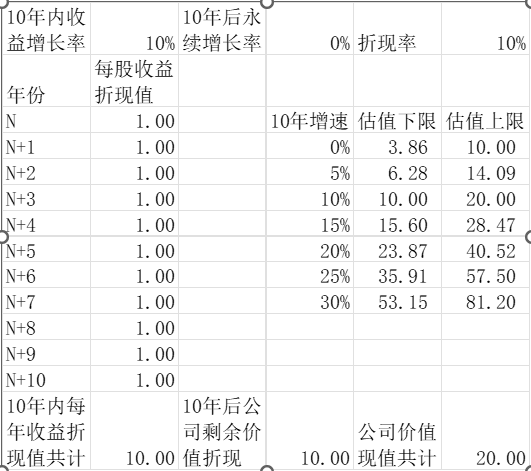 公司的价值就是公司未来现金流的折现,但是现金流折现的计算公式非常繁琐,而且其中包含若干预估的变量,变量的任何一点变动都会造成计算结果的巨大差异。2025年看了球友@Elon翻开每一页的一篇帖子非常受启发,非常感谢他的无私分享。大致的思路就是要合理简化计算过程,10年后的永续增长率直接设置为0,折现率取值10%,这样得到的公司PE估值比较简单,如图4所示。PE估值上限认为未来10年产生的都是自由现金流,因此PE估值包含了未来10年现金流的折现以及10年后永续现金流的折现。而PE估值下限认为未来10年的现金流都不是自由现金流,都要投入再生产,因此估值只包含10年后永续现金流的折现。如图4所示,10年0增长的公司,PE估值上限为10倍,估值下限为3.86倍;5%增长,则PE估值上限为14.09倍,估值下限为6.28倍;10%增长率,则PE估值上限为20倍,估值下限为10倍;15%增长率,则PE估值上限为28.47倍,估值下限为15.6倍;20%增长率,则PE估值上限为40.52倍,估值下限为23.87倍。