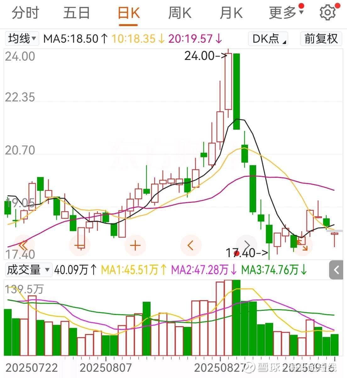 他现在的走势客观来讲不是特别乐观,因为趋势线已经开始拐头向下,但是幅度不大还有机会,主观上我确实特别看好它,但是我们也要根据实际情况来看,如果接下来的走势中继续下跌,跌破了17.4这个位置就果断离场,这里属于我的底线了。