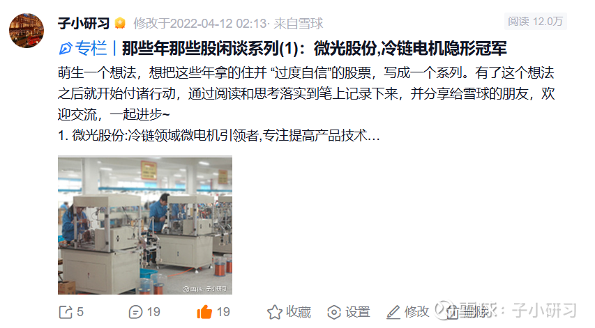 初入股市的前几年的投资中我也是经常亏钱,有过高位买入过周期股的惨痛的教训,也跟随市场情绪医药热买医药,芯片热买芯片,弄来弄去亏了不少。我反思自己的操作,每天就在思考什么股票适合散户,什么样的股票会涨,什么样的股票值得被投资,我几乎当时把每天都会把龙虎榜复盘,列举上股票的地区、市值、股价、股东人数、营收规模、利润规模、净资产规模等。2021年末12月在高铁上写完了我的第一个个股研究《那些年那些股闲谈系列(1):微光股份,冷链电机隐形冠军》,当年微光股份的获利,给亏损中的我继续投资A股的很大的动力,也让我坚信要想在A股获利必须得下苦功夫了解企业。