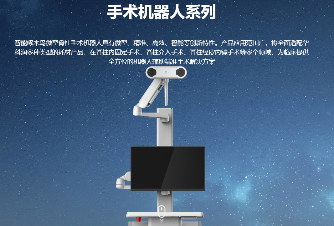 智能啄木鸟微型脊柱手术机器人是新一代的微型化智能手术辅助系统,具有微型、精准、高效、智能等创新特性,搭载高度针对性设计的手术规划与导航系统,实现手术全程可视化与可控化;系统配备了丰富手术配件组合,以差异化的技术特点和人性化的产品设计满足临床用户的切实需求。智能啄木鸟系统将全面适配华科润各类型耗材产品,适用于脊柱内固定手术、脊柱介入手术、脊柱经皮内镜手术等多个领域,为临床提供全面的微型精准机器人辅助手术解决方案。