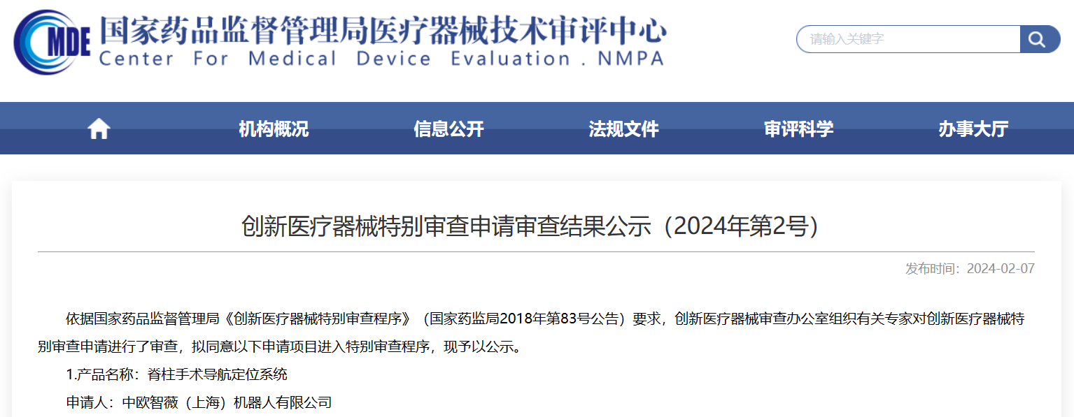 由中欧智薇(上海)机器人有限公司研发的脊柱手术导航定位系统(商品名:智能啄木鸟微型脊柱手术机器人)成功通过国家药品监督管理局医疗器械技术评审中心创新医疗器械特别审查申请