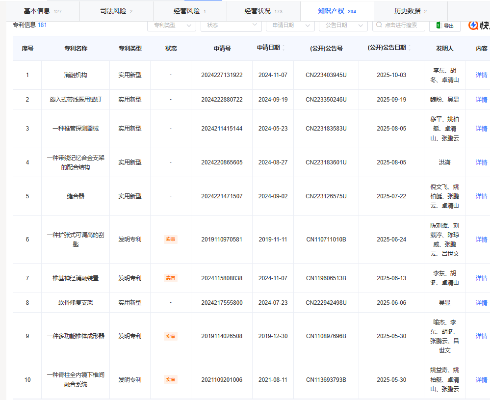 华科润是全国首家获得弯角椎体成形手术产品国内及欧盟批准上市的生产企业,也是国内弯角与传统椎体成形解决方案最为全面的手术器械厂家。作为弯角椎体成形技术全球领跑者,更是客户首选椎体成形器械的优质提供商。同时,公司拥有椎体成形全系列产品,以及脊柱内植入物系列、运动医学系列、骨科有源设备及耗材、人工智能等领域的创新产品。已累计申请国内专利项203项,包括发明专利83项、实用新型109项、外观设计11项;累计申请国际专利10项,已授权国际专利8项。目前已取得17张二类、12张三类NMPA医疗器械注册证,获得CE认证7项,美国/FDA认证12项,未来预期每年取证数量均不少于5项。