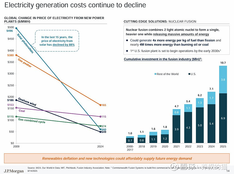 与此同时,核聚变发展势头强劲 :2025 年全球投资额将达 107 亿美元,美国首座核聚变电站预计将于 2030 年代初建成。核聚变每千克能量的产出量是核裂变的 4 倍,是化石燃料的近 400 万倍。