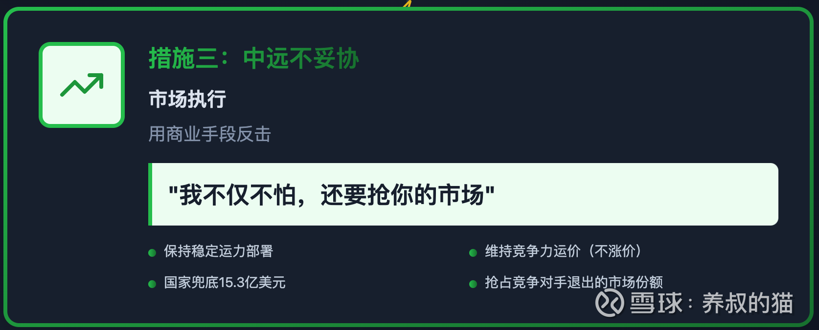 猫叔翻译一下中远海控的意思:我不退出,我不减船,美国你收钱我也照样跑!我不会因为301收费就涨价,我有国家兜底!如果竞争对手因为成本压力涨价或退出,我会乘机抢占市场份额!